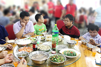 到残友来,最“苦恼”是体重问题,因为伙食太好,残友大餐五菜一汤,十五天菜式不重样,并且每个菜都来源于每一位残友的母亲菜。残友食堂,兄弟姐妹们像家人一般吃饭。