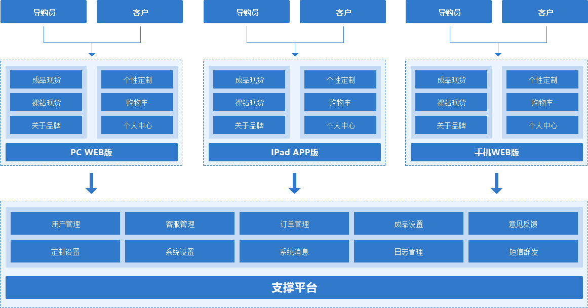 终端导购系统主要有三个版本:IPad APP版、手机web版、pc web版,可以满足不同场景的需要。此系统不但可以防止顾客流失,挖掘潜在客户,还能方便加盟商在线采购货品,是一套将现代信息技术、经营理念和管理思想相结合的信息化解决方案。
